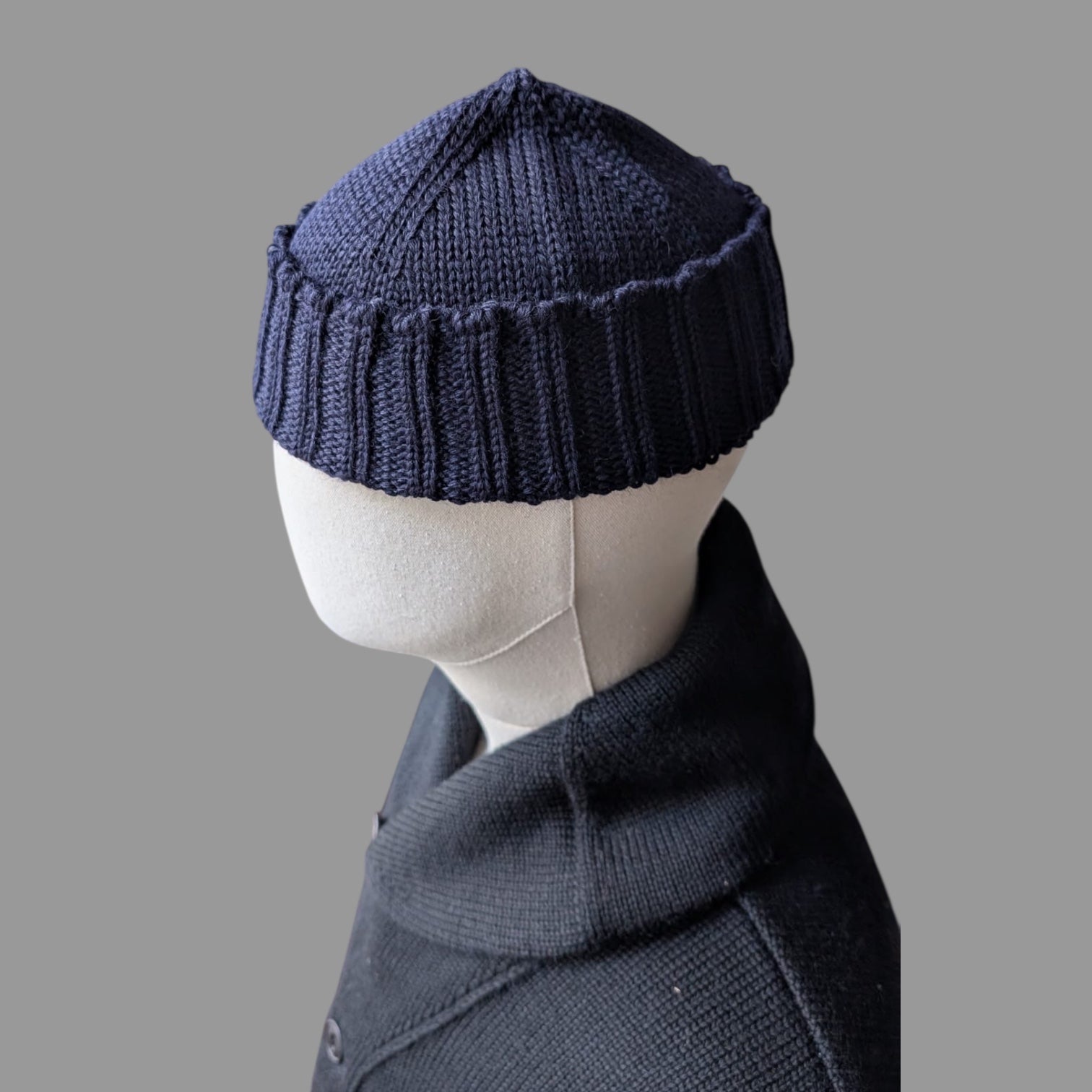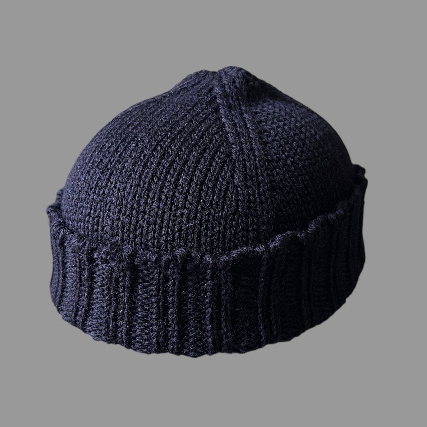 Seamless knitted hat with a ribbed turn up and criss-cross crown.