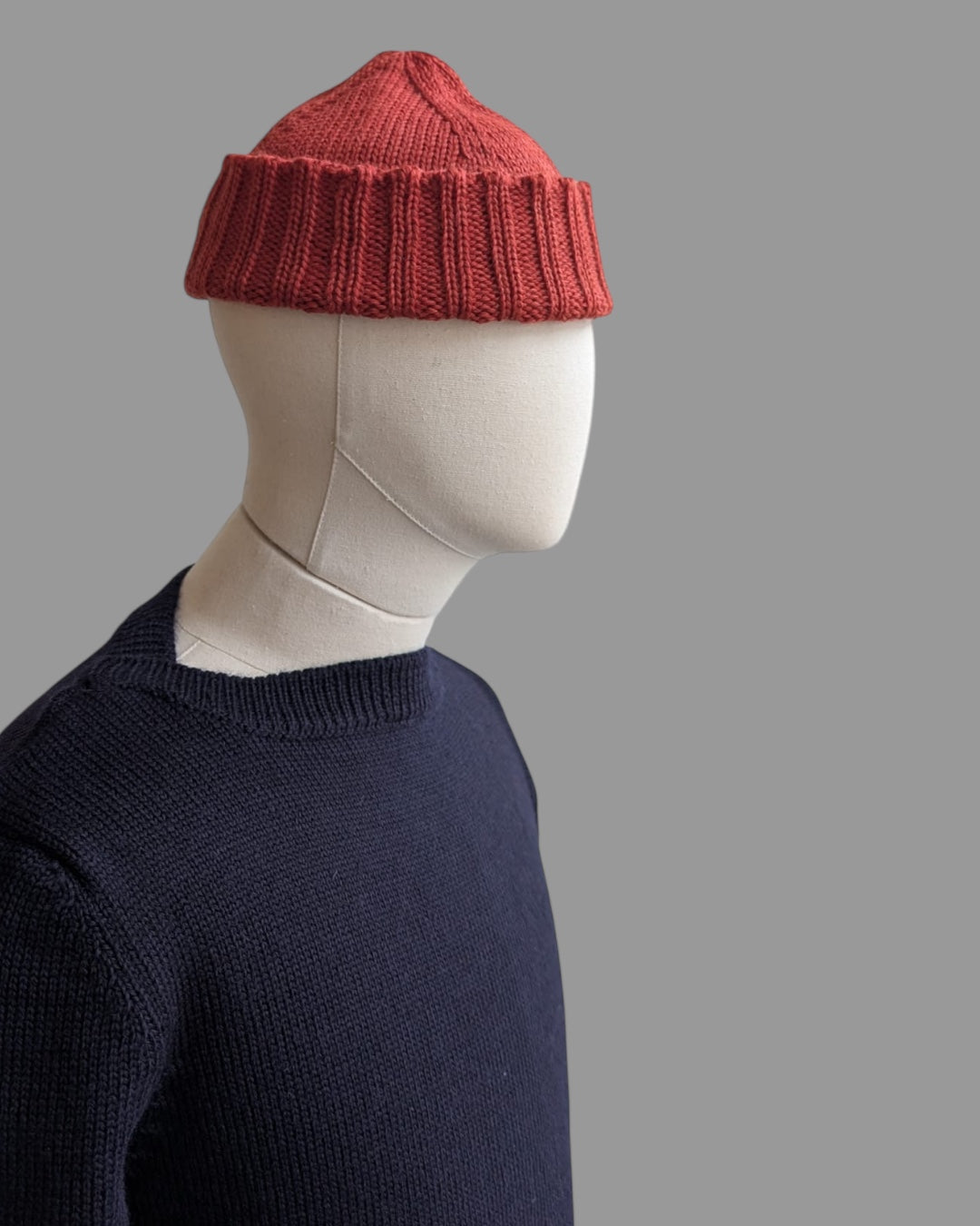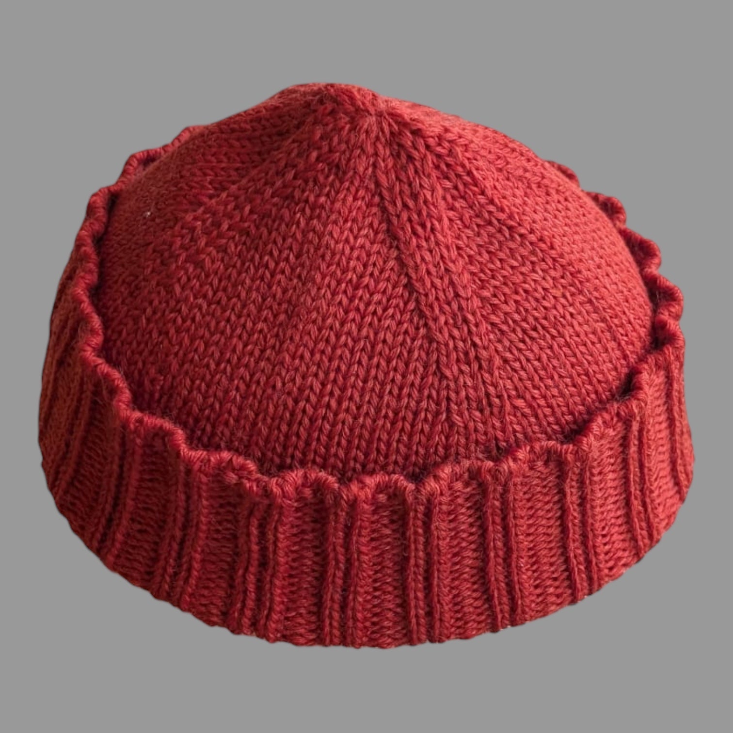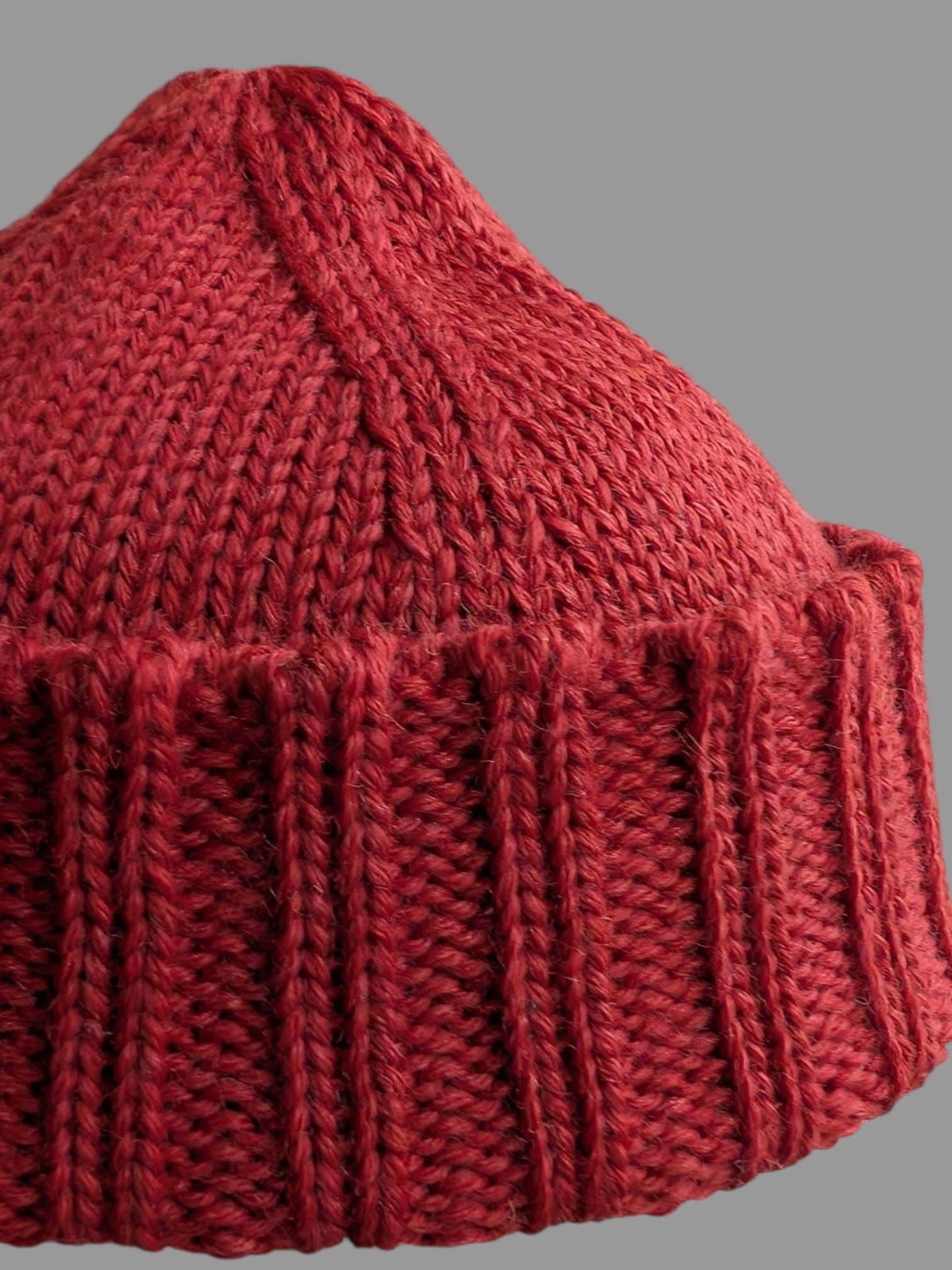 Seamless knitted hat with a ribbed turn up and criss-cross crown.