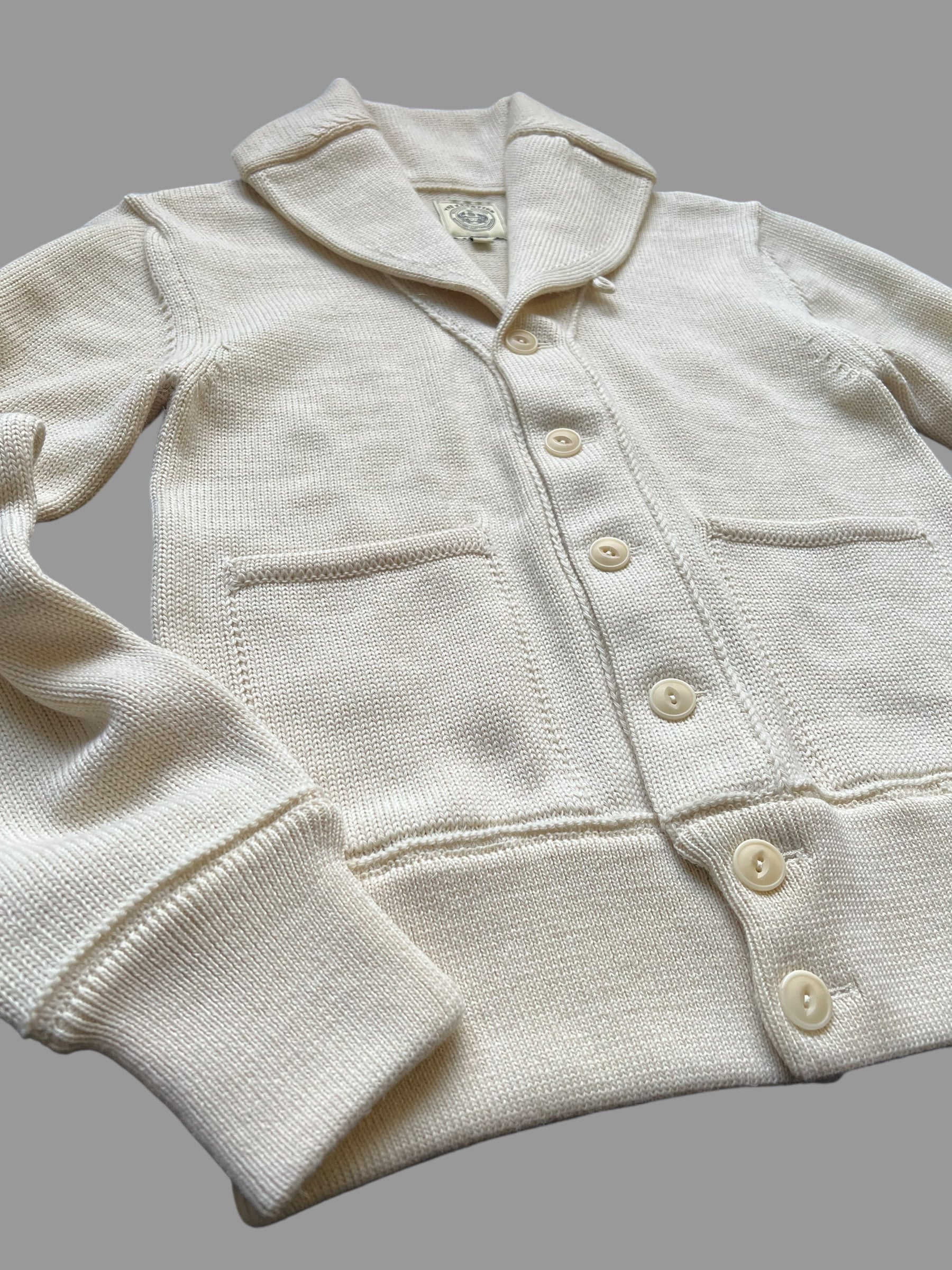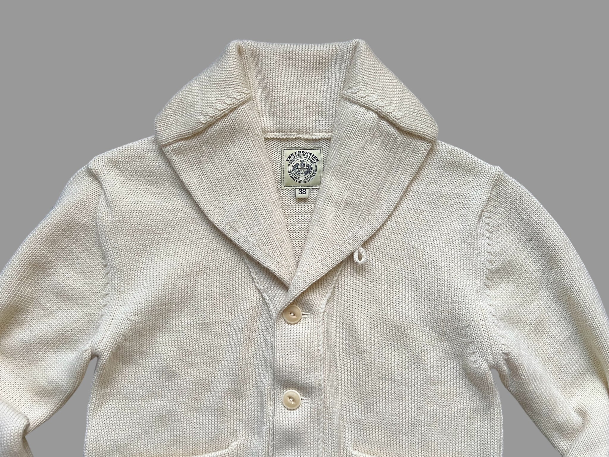 Our Frontier cardigan, with an updated shawl collar design, and extra button and loop for a snug collar closure.
